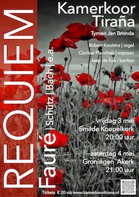 22-04-24Op vrijdag 3 en zaterdag 4 mei zingt Kamerkoor Tiraña het ontroerende Requiem van Fauré. Weinig stukken zijn zo troostend en contemplatief van aard als Fauré's Requiem. Het kamerkoor completeert het programma met muziek van Isaak, Finck, Stölzel, omkaderd met werk van Bach en Schütz. Wees erbij in Smilde en Groningen.