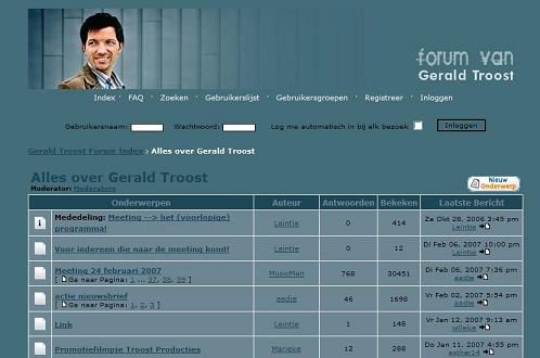 07-02-07Forumleden van de website van Gerald Troost krijgen de kans hem persoonlijk te ontmoeten. Fans van de gospelzanger kunnen eind februari in Veenendaal terecht. “Het verlangen ontstond bij veel forumleden om elkaar eens te ontmoeten.”