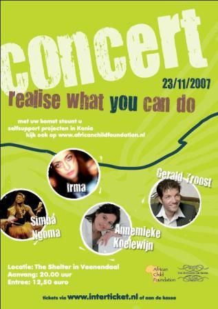 03-12-07De avond kwam langzaam op gang maar drie uur en vier artiesten later zong het publiek uit volle borst mee. Gerald Troost, IRMA, Ralph van Manen en de Keniaanse drumband Simba Ngoma leverden op 23 november elk hun bijdrage aan het benefietconcert voor de African Child Foundation. "Hij gaf voor 100% wat geven wij Hem terug?"