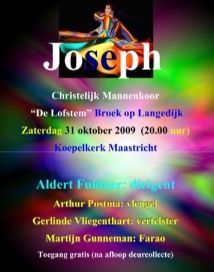 23-10-09Het Christelijk Mannenkoor 'De Lofstem' uit Broek op Langedijk zingt de liederen uit de musical 'Joseph and the Technicolor Dreamcoat' in concertvorm. Decor voor deze uitvoering is de Maastrichtse Koepelkerk, welke bekend staat om de goede akoestiek. Op deze speciale avond brengt 'De Lofstem ' eerst een aantal liederen uit het standaardrepertoire ten gehore. Na een korte uitleg over Jozef en zijn droom volgen de liederen uit de musical.