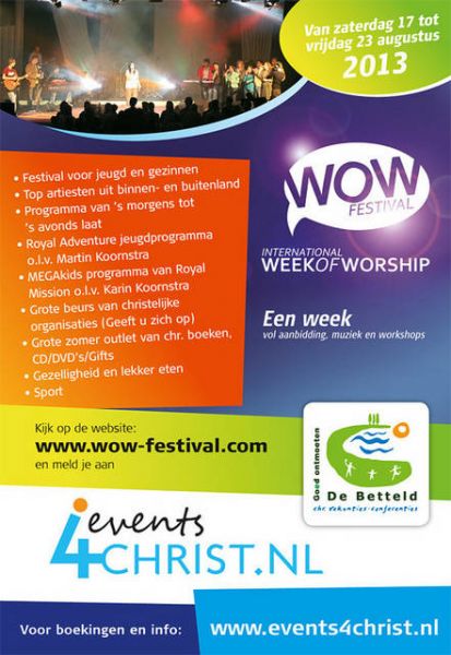 Het WOW Festival, oftewel Week of Worship is een week voor het hele gezin met concerten, een fantastisch leuk en uitgebreid kinderprogramma, boeiende en leerzame studies en een spannende talentenjacht. Voor iedereen, jong en oud, is er wel wat bij. Een goede, leuke en ontspannende verdieping van de vakantie. Hoewel de Week of Worship op camping De Betteld is, hoef je niet per se op de camping te staan, wil je deelnemen aan de Week of Worship. Campinggast of niet... Iedereen is van harte welkom -wanneer je ook maar wilt- om te genieten van concerten of mee te doen met activiteiten.